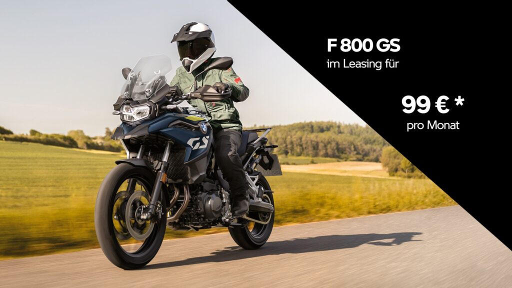 * Angebot der BMW Austria Leasing GmbH, BMW Restwertleasing für das Fahrzeug BMW F 800 GS, beinhaltet einen garantierten Restwert am Vertragsende bei vertragskonformer Nutzung. Gültig bei Kauf- und Vertragsabschluss von 01.10.2025 bis 31.12.2025, Auslieferung bis 30.04.2026. Anschaffungswert höchstens € 11.990,-, Anzahlung €2.882,-, Laufzeit 36 Monate, monatliche Leasingrate € 99,-, genaue Höhe abhängig von Sonderausstattung und Zubehör gem. individueller Konfiguration, 5.000 km p.a., Restwert € 6.228,81, Bearbeitungsgebühr € 260,-, Rechtsgeschäftsgebühr € 74,77, eff. Jahreszins 4,65%, Sollzins fix 2,99%, Gesamtbelastung € 13.009,58. Beträge inkl. NoVA und MwSt. Angebot freibleibend. Änderungen und Irrtümer vorbehalten. Angebot erhältlich bei allen teilnehmenden Händlern. Nicht kombinierbar mit anderen Leasing-Angeboten und Aktionen der BMW Austria Leasing GmbH. Für Konditionen für Gewerbetreibende stehen Ihnen die teilnehmenden BMW Partner zur Verfügung.