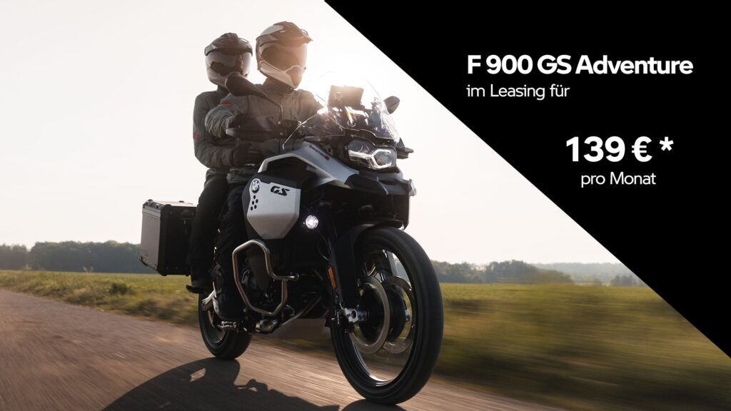 * Angebot der BMW Austria Leasing GmbH, BMW Restwertleasing für das Fahrzeug BMW F 900 GS Adventure, beinhaltet einen garantierten Restwert am Vertragsende bei vertragskonformer Nutzung. Gültig bei Kauf- und Vertragsabschluss von 01.10.2025 bis 31.12.2025, Auslieferung bis 30.04.2026. Anschaffungswert höchstens € 16.400,-, Anzahlung €3.818,-, Laufzeit 36 Monate, monatliche Leasingrate € 139,-, genaue Höhe abhängig von Sonderausstattung und Zubehör gem. individueller Konfiguration, 5.000 km p.a., Restwert € 8.519,80, Bearbeitungsgebühr € 260,-, Rechtsgeschäftsgebühr € 102,34, eff. Jahreszins 4,29%, Sollzins fix 2,99%, Gesamtbelastung € 17.704,14. Beträge inkl. NoVA und MwSt. Angebot freibleibend. Änderungen und Irrtümer vorbehalten. Angebot erhältlich bei allen teilnehmenden Händlern. Nicht kombinierbar mit anderen Leasing-Angeboten und Aktionen der BMW Austria Leasing GmbH. Für Konditionen für Gewerbetreibende stehen Ihnen die teilnehmenden BMW Partner zur Verfügung.