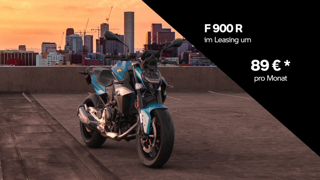 * Angebot der BMW Austria Leasing GmbH, BMW Restwertleasing für das Fahrzeug BMW F 900 R, beinhaltet einen garantierten Restwert am Vertragsende bei vertragskonformer Nutzung. Gültig bei Kauf- und Vertragsabschluss von 01.10.2025 bis 31.12.2025, Auslieferung bis 30.04.2026. Anschaffungswert höchstens € 9.990,-, Anzahlung €1.896,-, Laufzeit 36 Monate, monatliche Leasingrate € 89,-, genaue Höhe abhängig von Sonderausstattung und Zubehör gem. individueller Konfiguration, 5.000 km p.a., Restwert € 5.496,50, Bearbeitungsgebühr € 260,-, Rechtsgeschäftsgebühr € 59,16, eff. Jahreszins 4,77%, Sollzins fix 2,99%, Gesamtbelastung € 10.915,66. Beträge inkl. NoVA und MwSt. Angebot freibleibend. Änderungen und Irrtümer vorbehalten. Angebot erhältlich bei allen teilnehmenden Händlern. Nicht kombinierbar mit anderen Leasing-Angeboten und Aktionen der BMW Austria Leasing GmbH. Für Konditionen für Gewerbetreibende stehen Ihnen die teilnehmenden BMW Partner zur Verfügung.