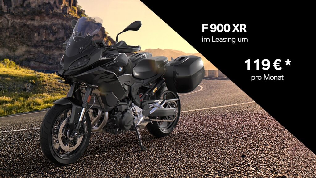 * Angebot der BMW Austria Leasing GmbH, BMW Restwertleasing für das Fahrzeug BMW F 900 XR, beinhaltet einen garantierten Restwert am Vertragsende bei vertragskonformer Nutzung. Gültig bei Kauf- und Vertragsabschluss von 01.10.2025 bis 31.12.2025, Auslieferung bis 30.04.2026. Anschaffungswert höchstens € 12.990,-, Anzahlung €2.717,-, Laufzeit 36 Monate, monatliche Leasingrate € 119,-, genaue Höhe abhängig von Sonderausstattung und Zubehör gem. individueller Konfiguration, 5.000 km p.a., Restwert € 6.748,31, Bearbeitungsgebühr € 260,-, Rechtsgeschäftsgebühr € 81,21, eff. Jahreszins 4,51%, Sollzins fix 2,99%, Gesamtbelastung € 14.090,52. Beträge inkl. NoVA und MwSt. Angebot freibleibend. Änderungen und Irrtümer vorbehalten. Angebot erhältlich bei allen teilnehmenden Händlern. Nicht kombinierbar mit anderen Leasing-Angeboten und Aktionen der BMW Austria Leasing GmbH. Für Konditionen für Gewerbetreibende stehen Ihnen die teilnehmenden BMW Partner zur Verfügung.
