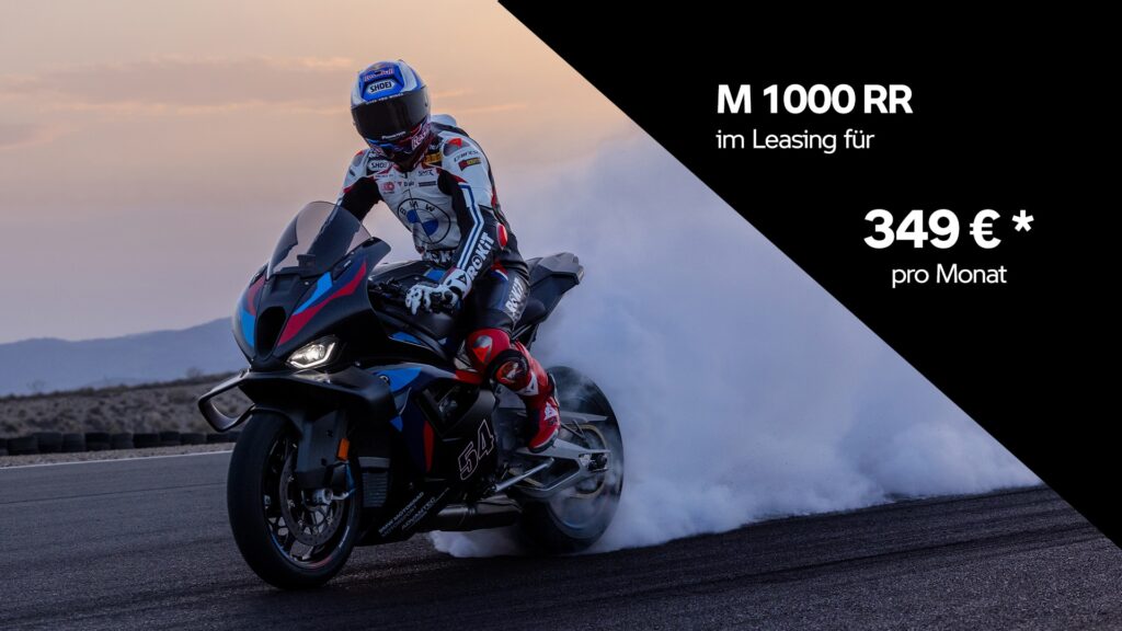 * Angebot der BMW Austria Leasing GmbH, BMW Restwertleasing für das Fahrzeug BMW M 1000 RR, beinhaltet einen garantierten Restwert am Vertragsende bei vertragskonformer Nutzung. Gültig bei Kauf- und Vertragsabschluss von 01.10.2025 bis 31.12.2025, Auslieferung bis 30.04.2026. Anschaffungswert höchstens € 43.890,-, Anzahlung € 11.242,-, Laufzeit 36 Monate, monatliche Leasingrate € 349,-, genaue Höhe abhängig von Sonderausstattung und Zubehör gem. individueller Konfiguration, 5.000 km p.a., Restwert € 23.424,09, Bearbeitungsgebühr € 260,-, Rechtsgeschäftsgebühr € 276,15, eff. Jahreszins 4,78%, Sollzins fix 3,99%, Gesamtbelastung € 47.766,24. Beträge inkl. NoVA und MwSt. Angebot freibleibend. Änderungen und Irrtümer vorbehalten. Angebot erhältlich bei allen teilnehmenden Händlern. Nicht kombinierbar mit anderen Leasing-Angeboten und Aktionen der BMW Austria Leasing GmbH. Für Konditionen für Gewerbetreibende stehen Ihnen die teilnehmenden BMW Partner zur Verfügung.