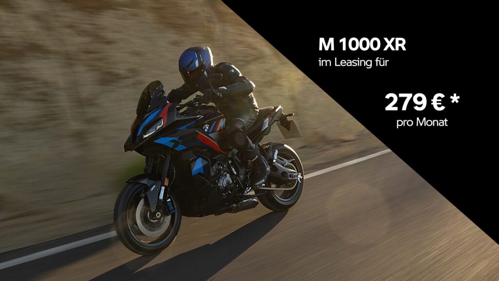 * Angebot der BMW Austria Leasing GmbH, BMW Restwertleasing für das Fahrzeug BMW M 1000 XR, beinhaltet einen garantierten Restwert am Vertragsende bei vertragskonformer Nutzung. Gültig bei Kauf- und Vertragsabschluss von 01.10.2025 bis 31.12.2025, Auslieferung bis 30.04.2026. Anschaffungswert höchstens € 30.650,-, Anzahlung € 6.652,-, Laufzeit 36 Monate, monatliche Leasingrate € 279,-, genaue Höhe abhängig von Sonderausstattung und Zubehör gem. individueller Konfiguration, 5.000 km p.a., Restwert € 16.357,91, Bearbeitungsgebühr € 260,-, Rechtsgeschäftsgebühr € 193,67, eff. Jahreszins 4,90%, Sollzins fix 3,99%, Gesamtbelastung € 33.507,58. Beträge inkl. NoVA und MwSt. Angebot freibleibend. Änderungen und Irrtümer vorbehalten. Angebot erhältlich bei allen teilnehmenden Händlern. Nicht kombinierbar mit anderen Leasing-Angeboten und Aktionen der BMW Austria Leasing GmbH. Für Konditionen für Gewerbetreibende stehen Ihnen die teilnehmenden BMW Partner zur Verfügung.