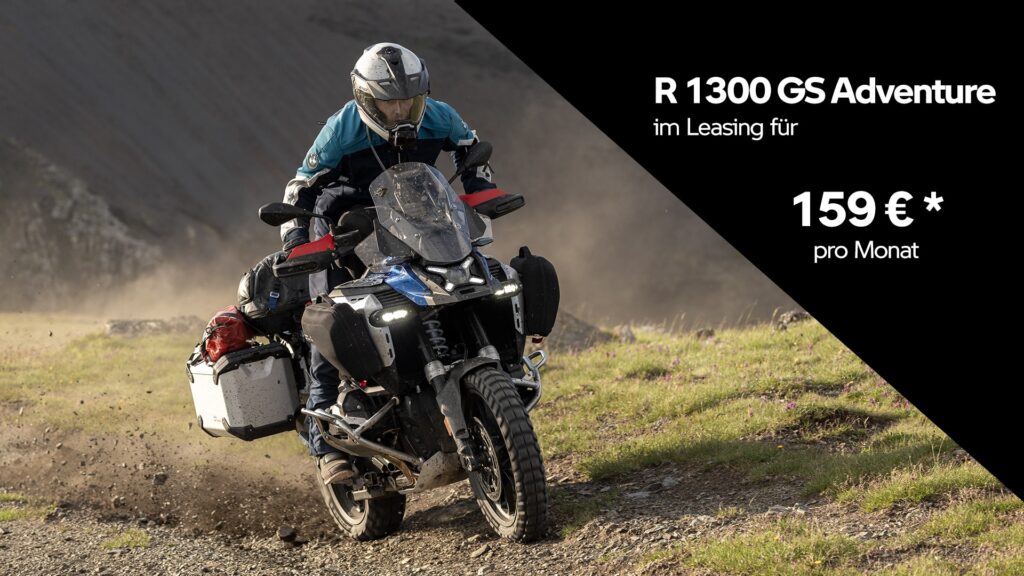 * Angebot der BMW Austria Leasing GmbH, BMW Restwertleasing für das Fahrzeug BMW R 1300 GS Adventure, beinhaltet einen garantierten Restwert am Vertragsende bei vertragskonformer Nutzung. Gültig bei Kauf- und Vertragsabschluss von 01.10.2025 bis 31.12.2025, Auslieferung bis 30.04.2026. Anschaffungswert höchstens € 24.760,-, Anzahlung € 5.971,-, Laufzeit 36 Monate, monatliche Leasingrate € 159,-, genaue Höhe abhängig von Sonderausstattung und Zubehör gem. individueller Konfiguration, 5.000 km p.a., Restwert € 14.553,93, Bearbeitungsgebühr € 260,-, Rechtsgeschäftsgebühr € 135,66, eff. Jahreszins 3,90%, Sollzins fix 2,99%, Gesamtbelastung € 26.644,59. Beträge inkl. NoVA und MwSt. Angebot freibleibend. Änderungen und Irrtümer vorbehalten. Angebot erhältlich bei allen teilnehmenden Händlern. Nicht kombinierbar mit anderen Leasing-Angeboten und Aktionen der BMW Austria Leasing GmbH. Für Konditionen für Gewerbetreibende stehen Ihnen die teilnehmenden BMW Partner zur Verfügung.