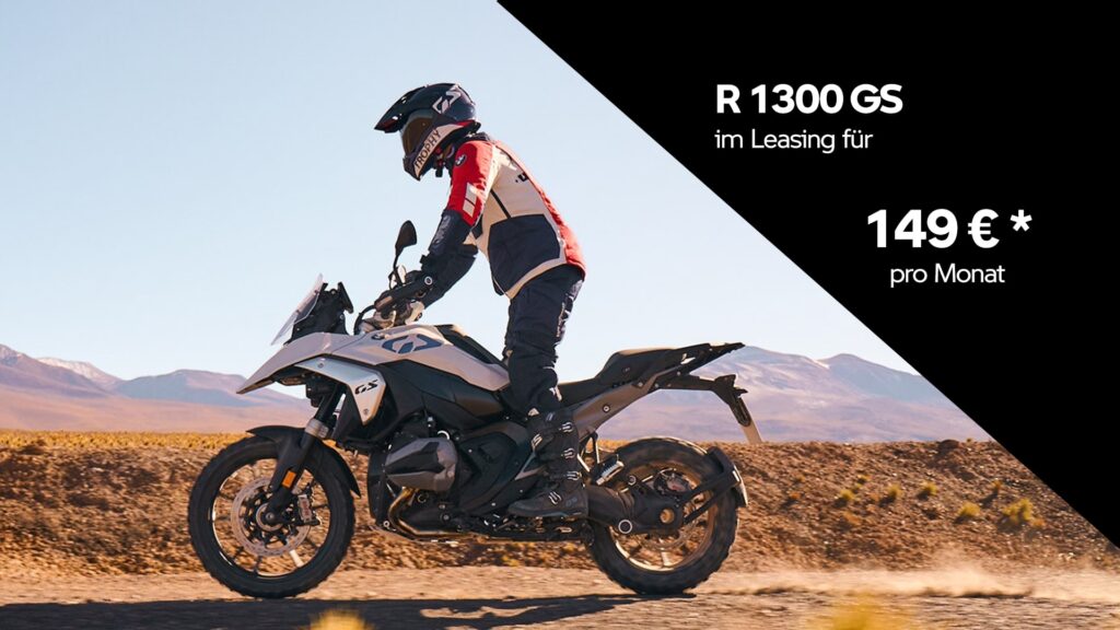 * Angebot der BMW Austria Leasing GmbH, BMW Restwertleasing für das Fahrzeug BMW R 1300 GS, beinhaltet einen garantierten Restwert am Vertragsende bei vertragskonformer Nutzung. Gültig bei Kauf- und Vertragsabschluss von 01.10.2025 bis 31.12.2025, Auslieferung bis 30.04.2026. Anschaffungswert höchstens € 22.590,-, Anzahlung € 5.312,-, Laufzeit 36 Monate, monatliche Leasingrate € 149,-, genaue Höhe abhängig von Sonderausstattung und Zubehör gem. individueller Konfiguration, 5.000 km p.a., Restwert € 13.278,40, Bearbeitungsgebühr € 260,-, Rechtsgeschäftsgebühr € 123,84, eff. Jahreszins 3,95%, Sollzins fix 2,99%, Gesamtbelastung € 24.338,24. Beträge inkl. NoVA und MwSt. Angebot freibleibend. Änderungen und Irrtümer vorbehalten. Angebot erhältlich bei allen teilnehmenden Händlern. Nicht kombinierbar mit anderen Leasing-Angeboten und Aktionen der BMW Austria Leasing GmbH. Für Konditionen für Gewerbetreibende stehen Ihnen die teilnehmenden BMW Partner zur Verfügung.