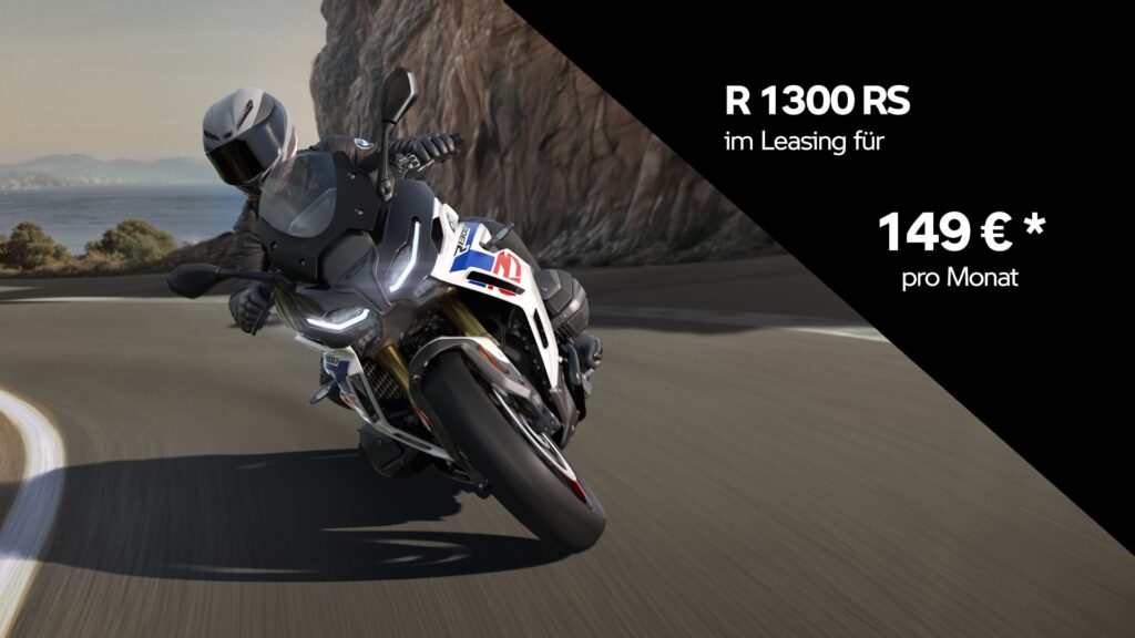 * Angebot der BMW Austria Leasing GmbH, BMW Restwertleasing für das Fahrzeug BMW R 1300 RS, beinhaltet einen garantierten Restwert am Vertragsende bei vertragskonformer Nutzung. Gültig bei Kauf- und Vertragsabschluss von 01.10.2025 bis 31.12.2025, Auslieferung bis 30.04.2026. Anschaffungswert höchstens € 18.890,-, Anzahlung € 4.535,-, Laufzeit 36 Monate, monatliche Leasingrate € 149,-, genaue Höhe abhängig von Sonderausstattung und Zubehör gem. individueller Konfiguration, 5.000 km p.a., Restwert € 10.081,59, Bearbeitungsgebühr € 260,-, Rechtsgeschäftsgebühr € 114,83, eff. Jahreszins 4,16%, Sollzins fix 2,99%, Gesamtbelastung € 20.355,42. Beträge inkl. NoVA und MwSt. Angebot freibleibend. Änderungen und Irrtümer vorbehalten. Angebot erhältlich bei allen teilnehmenden Händlern. Nicht kombinierbar mit anderen Leasing-Angeboten und Aktionen der BMW Austria Leasing GmbH. Für Konditionen für Gewerbetreibende stehen Ihnen die teilnehmenden BMW Partner zur Verfügung.